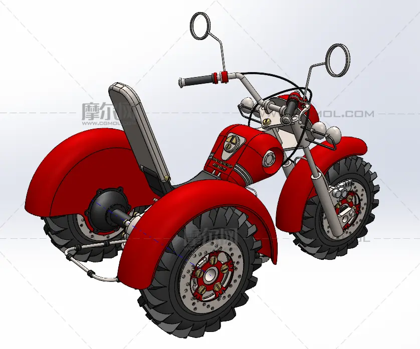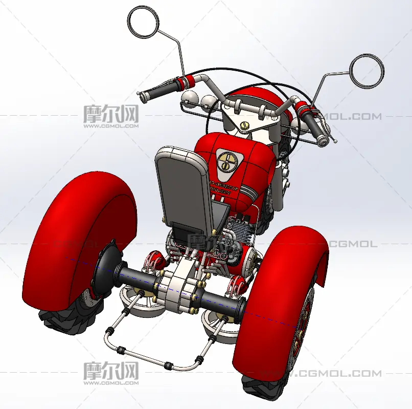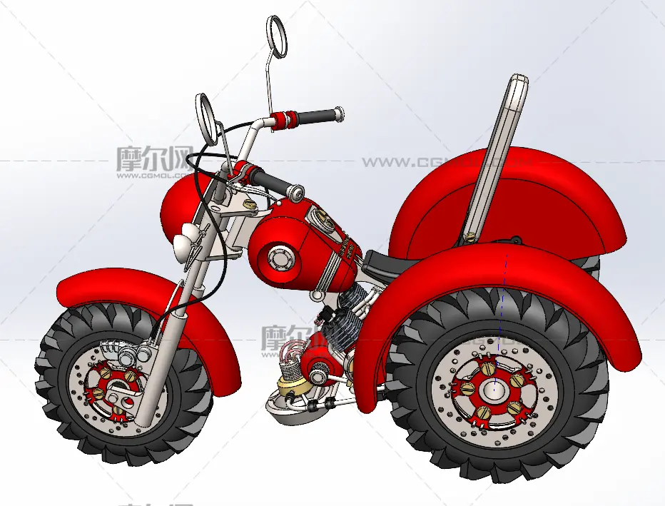 三轮摩托车模型, 该作品由作者(机械大攻城狮)上传发布。 文件格式有:sldprt, sldasm, step, 建议使用solidworks2019等软件打开。文件大小: 26.80MB