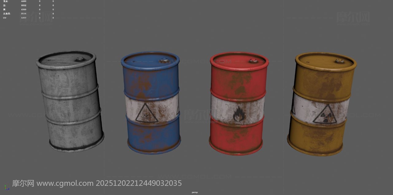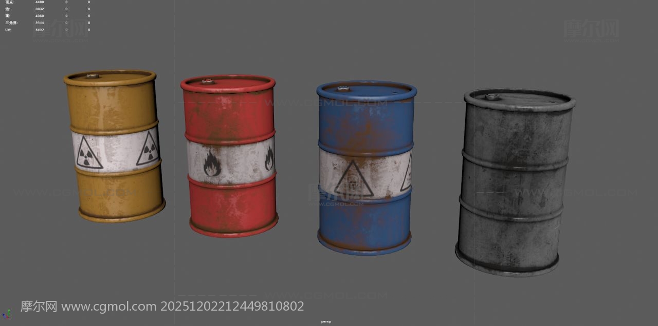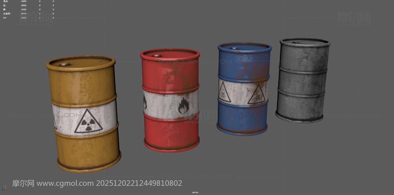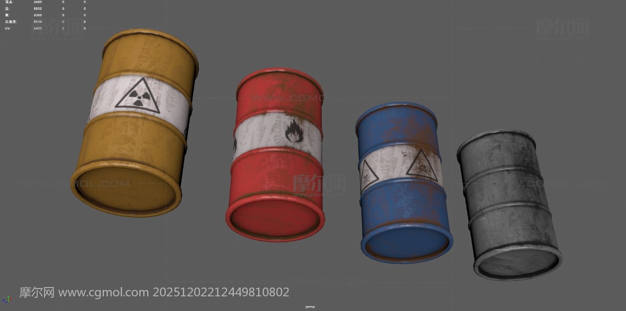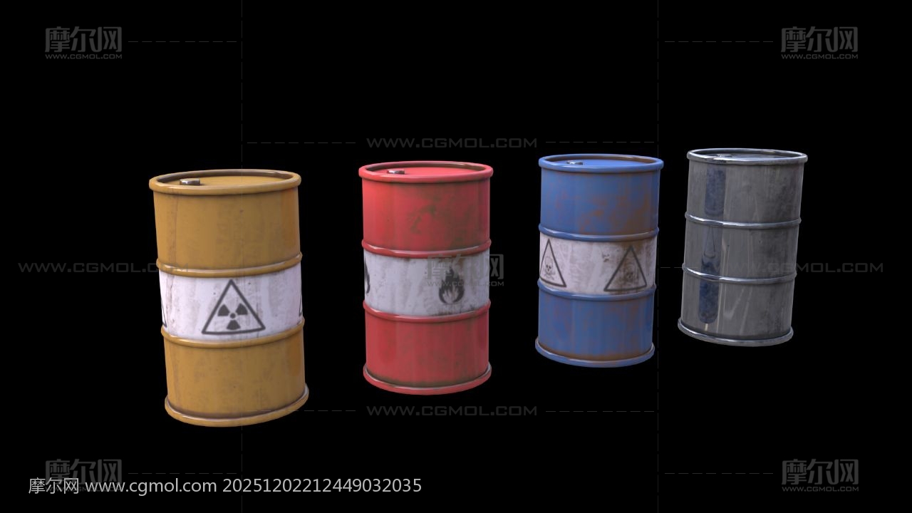 油桶 铁桶 工业桶易燃物, 该作品由作者(MOL74WA4X7E22TK)上传发布。 文件格式有:max, ma/mb, obj, fbx, 建议使用max2018, maya2020等软件打开。文件大小: 3.55MB