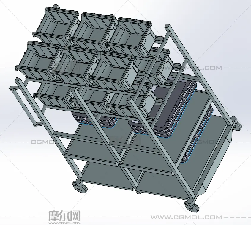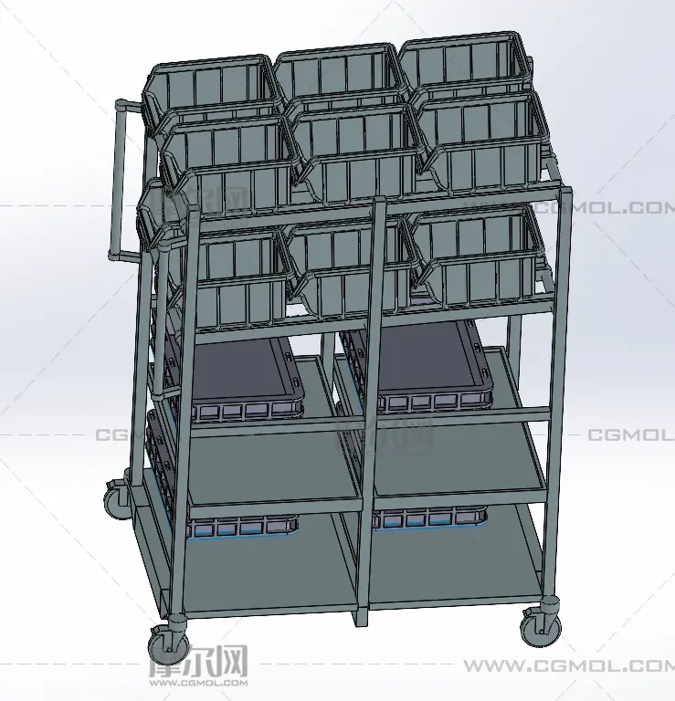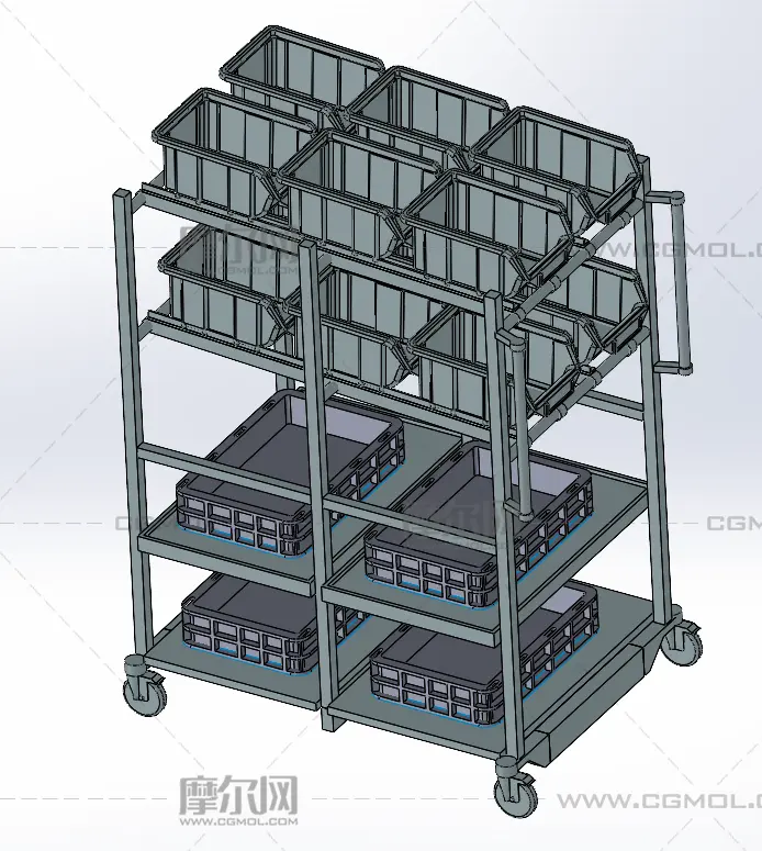 料框放置架小车, 该作品由作者(机械大攻城狮)上传发布。 文件格式有:step, 建议使用solidworks2018等软件打开。文件大小: 2.19MB
